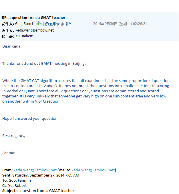 “尽管GMAT的CAT算法保证所有考生的题型分布比例相同,但它并不作单项(如句改,逻辑)计分。每道题都会直接影响到最后分数。很少有考生出现单项表现差异极大的现象。“