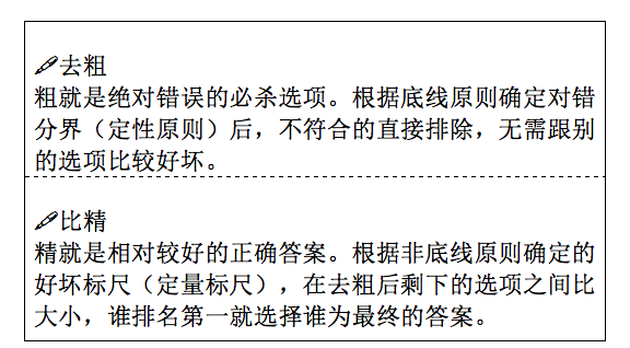 面对GMAT语文题时,这种在去粗和比精之间的切换就更加必不可少了。因为没有完美选项,我们不得不在各种残缺的选择中寻找毛病最小的那一个。不完美变成我们GMAT考生必须面对的现实!当然,不完美不意味着可以犯下致命的错误,死罪还是死缓的区分就在于评判标准属于定性原则,还是定量标尺。